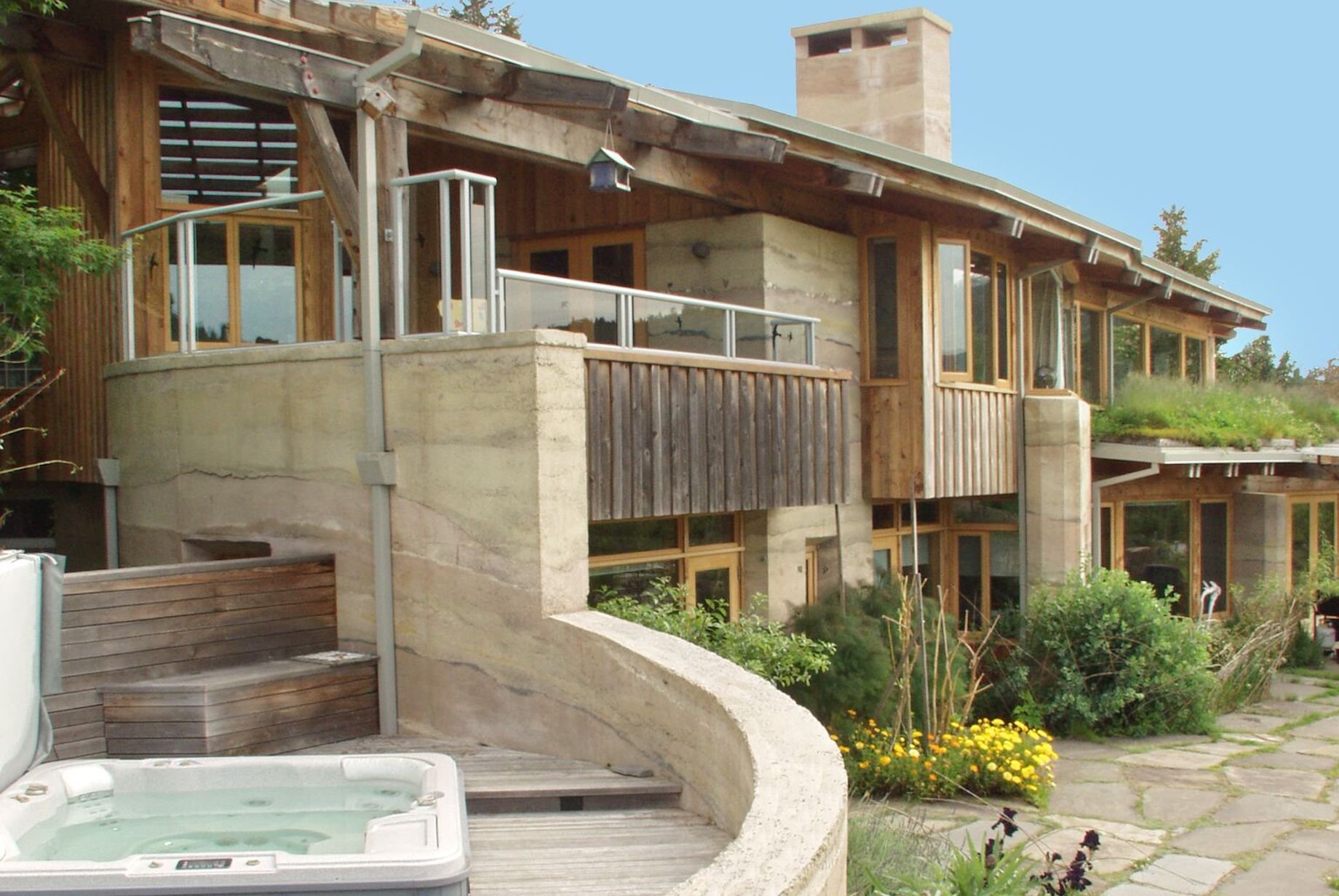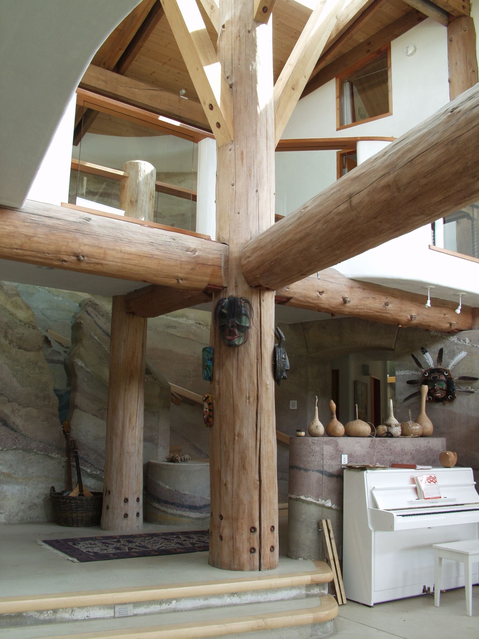 Radiant heat, puddled earth floors, geothermal heat pump, oxygen-treated septic, recycled beams and rafters, sustainable-harvest timbers, HRV, masonry stove, cold cellar and sod roof